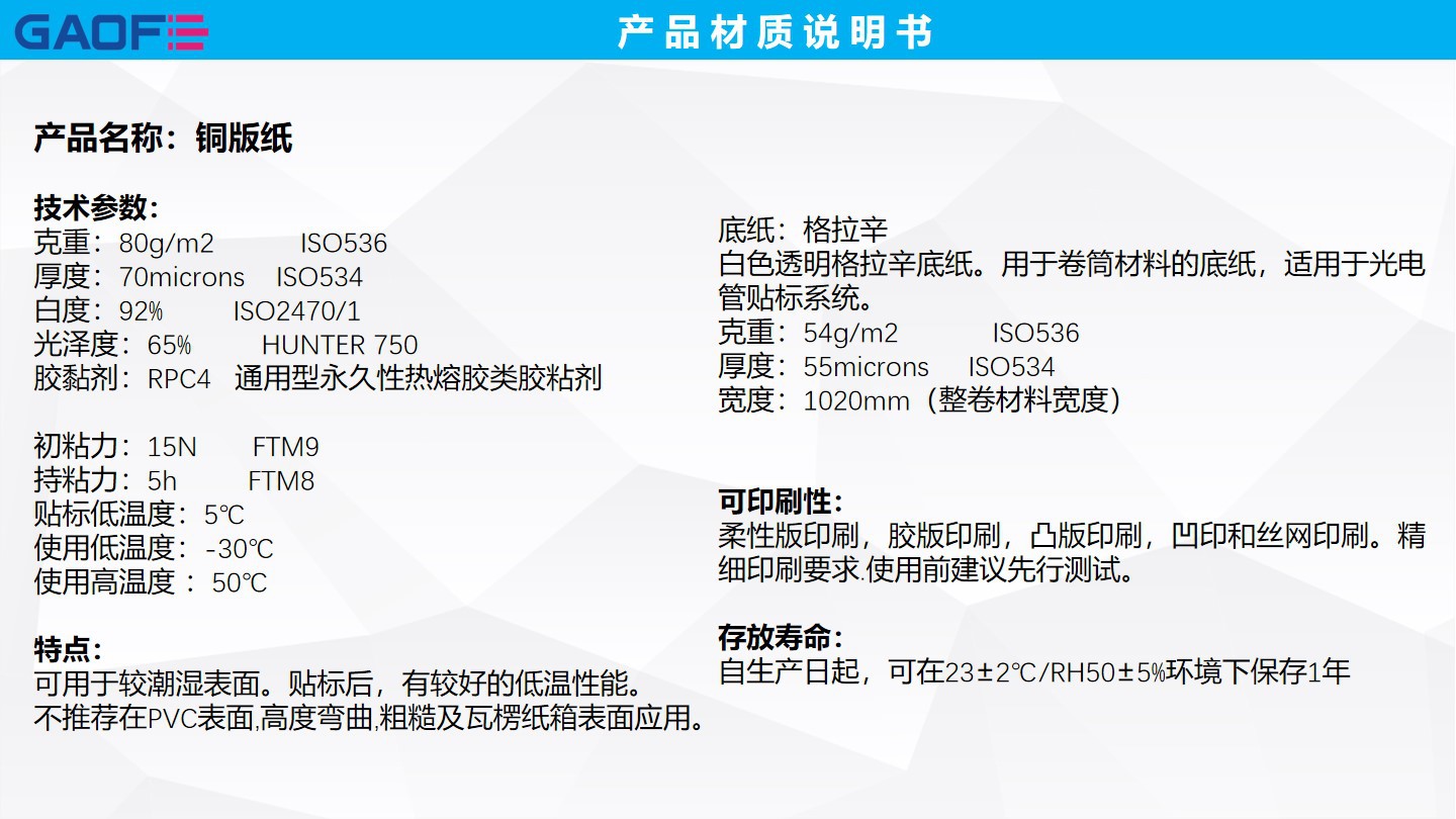 印刷及加工: 經(jīng)超級(jí)砑光處理的半高光表面,非常適合用于各種印刷工藝進(jìn)行單色及彩色印刷。