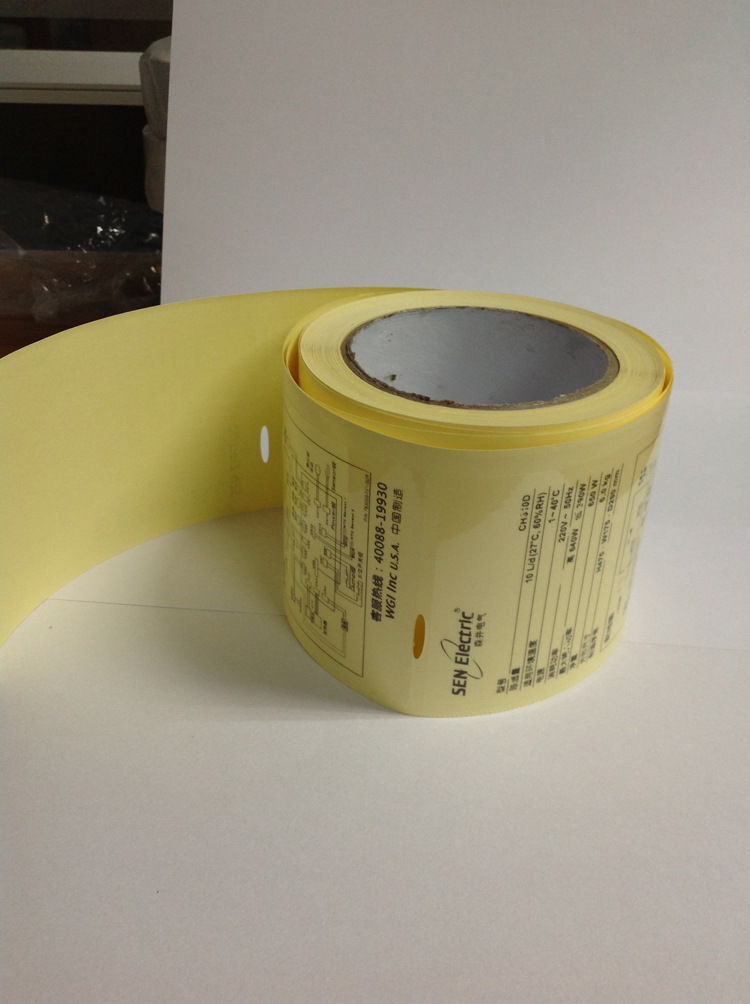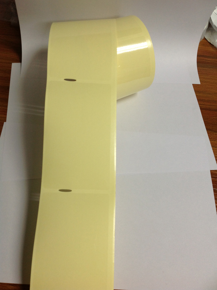 基材:25um(或50um)涂層處理聚酞亞胺薄膜,未經(jīng)涂層處理的聚酞亞胺不能滿(mǎn)足性能要求、涂層處理能更加地滿(mǎn)足工藝上所需的打印條碼性以及對(duì)材料顏色與光澤度的要求。