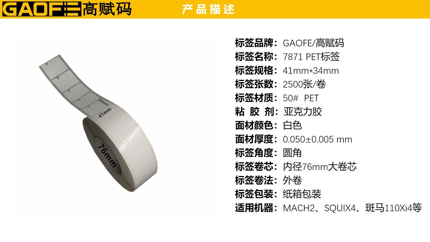 強(qiáng)粘PET貼紙 41mm*34mm PET標(biāo)簽 7871 超粘不干膠PET標(biāo)簽-高賦碼