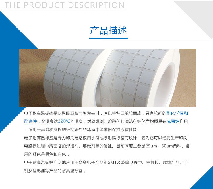 高溫標(biāo)簽聚酰亞胺薄膜為基材,涂以特種壓敏膠而成,具有較好的耐化學(xué)性和耐磨性,耐溫范圍200℃~600℃,對助焊劑、熔融劑和清潔劑等化學(xué)物質(zhì)具有抗腐蝕作用,使用于高溫和磨損的極端惡劣的環(huán)境中能保持原本性能。它是專為印刷電路板用字符或條形碼標(biāo)簽而設(shè)計,因為它可以經(jīng)受生產(chǎn)印刷電路板過程中所面臨的焊接劑、熔融劑等的侵蝕。目前厚度主要是25um、50um兩種。常用的顏色是黑色和白色 。高溫標(biāo)簽廣泛地應(yīng)用于眾多電子產(chǎn)品的SMT及波峰制程中、主機板、腐蝕產(chǎn)品、手機及鋰電池等產(chǎn)品的PCB板高溫標(biāo)簽。