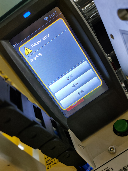 客戶: 打印機(jī)型號是CAB SQUIX4帶手臂,打印出一截并且提示色帶用完報錯
