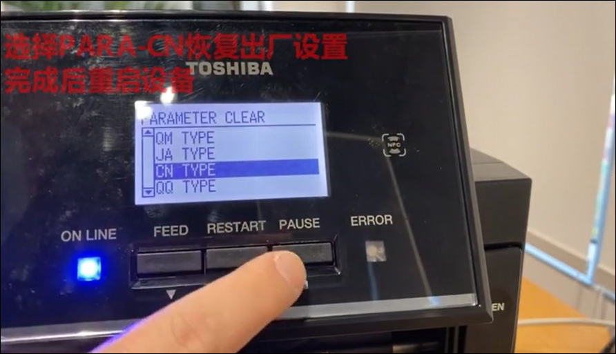 4.選擇 CN TYPE——按PAUSE鍵確認(rèn)——等待出廠設(shè)置完成——重啟打印機(jī)。