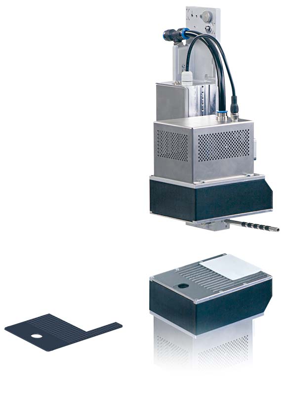 借由風(fēng)扇吸取標(biāo)簽并利用強(qiáng)力的噴射氣流經(jīng)由調(diào)整過的噴嘴吹貼標(biāo)簽。依據(jù)標(biāo)簽尺寸,自產(chǎn)品到剝離板的距離最大為 200 mm。
