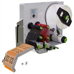 吸附式輸送帶貼標(biāo)手臂位于剝離板前。打印完成的標(biāo)簽會藉由吸附式輸送帶傳送至剝離位置并透過外部信號貼標(biāo)于包裝上。在剝離過程中可同時打印下一張標(biāo)簽。
